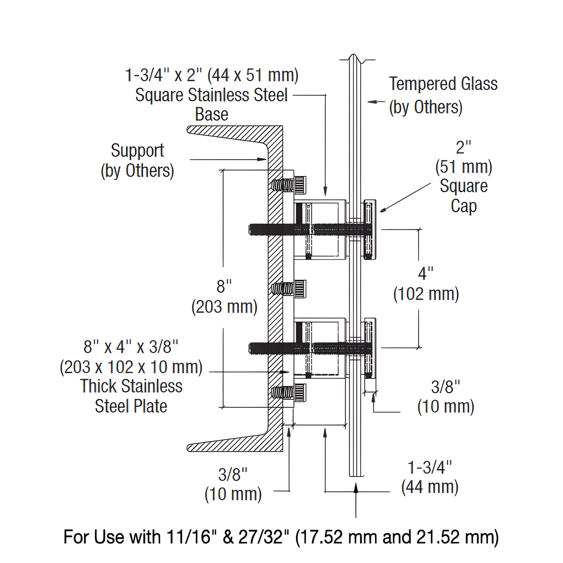 CRL Glass Rail Square Standoff Fittings (SKU: SS0B20BSC) can mount laminated glass up to 27/32" (21.52 mm) thick. This 316-grade stainless steel assembly features 2" (51 mm) square caps on threaded bolts to secure the glass. Each 2" (51 mm) square standoff is fastened to a 3/8" (10 mm) thick stainless steel plate that is pre-drilled for mounting to wood, concrete, or steel substrates. Ideal for glass railing, balustrade, and frameless glass applications where corrosion resistance and a clean modern look are required.