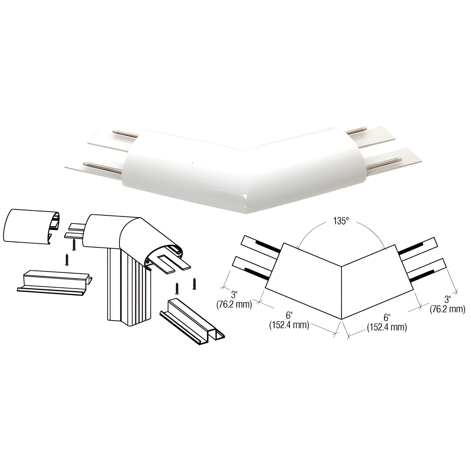 CRL 350X Series Horizontal Corners (SKU: 35TRH3W) are precision fabricated, finished, powder coated, and individually packaged. This interior slip-fit 135º corner provides a hairline joint in straight railing sections without the need for field mitering. Use CRL Cat. No. TEK1 Tek Screws for fastening. Ideal for commercial and residential aluminum railing systems requiring durable, finished corner components.