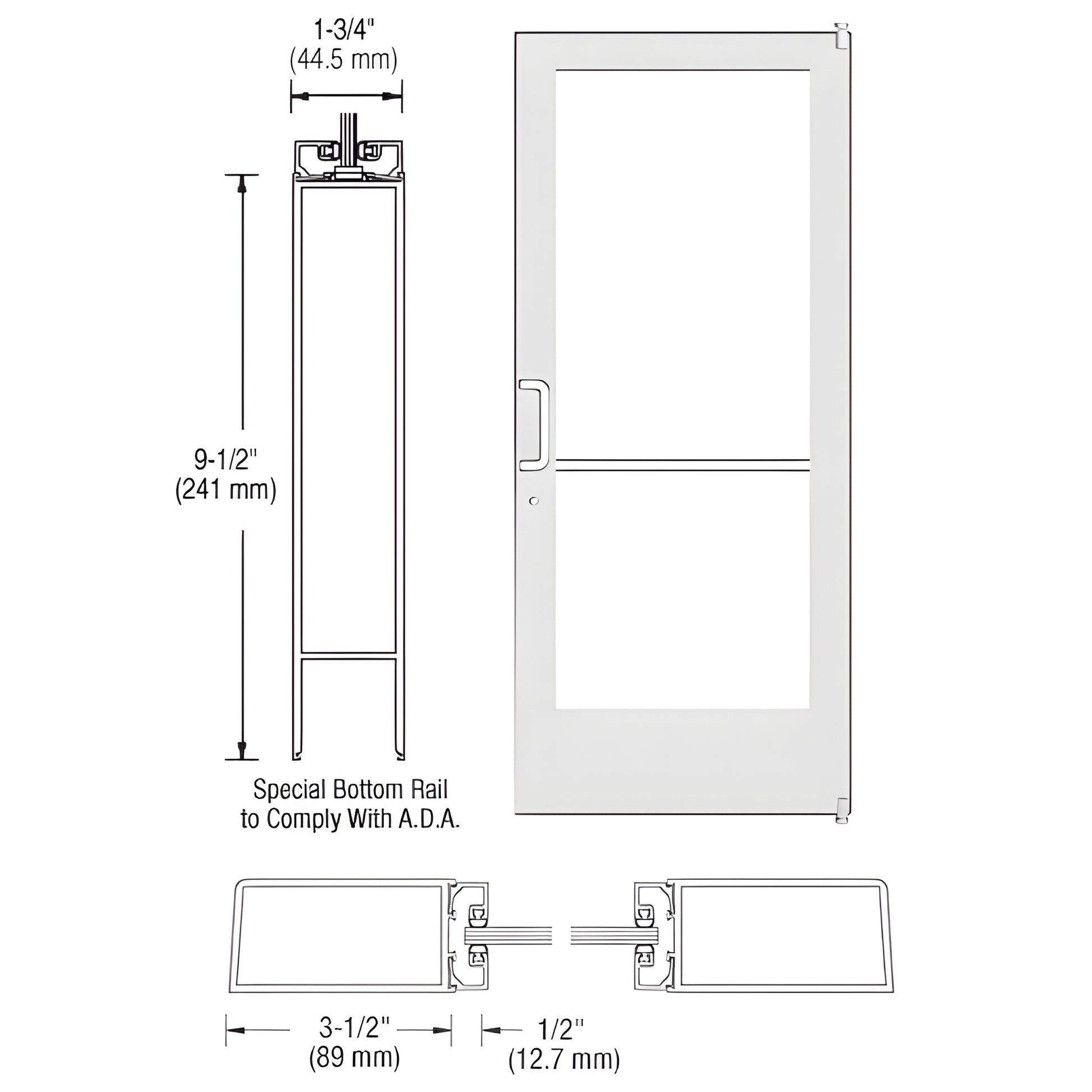 CRL Custom Medium Stile Entrance Door features 3-1/2" (89 mm) stiles and a 2-1/8" (54 mm) top rail, designed for commercial storefront and office entry installations. Glass stops are set for 1/4" (6 mm) tempered glass (by others). Door is prepared for Offset Pivot hardware and other optional configurations through custom fabrication.
