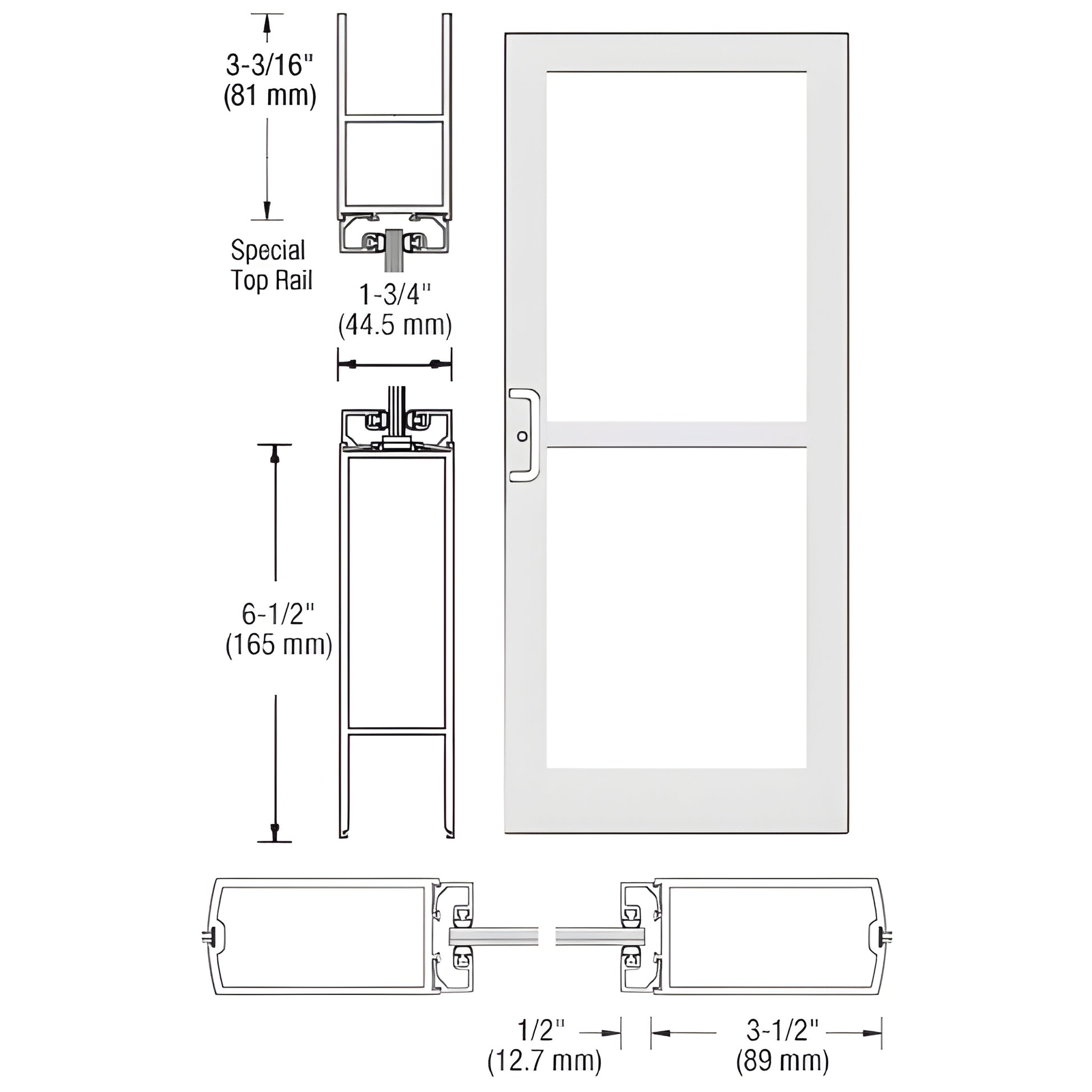 This Custom Medium Stile Entrance Door (SKU: DZ41752) features 3-1/2" (89 mm) stiles, a 3-3/16" (81 mm) top rail, and a 6-1/2" (165 mm) bottom rail. Designed for commercial storefront and tempered glass entrance applications, the door ships with stiles prepared for center pivot hardware and glass stops for 1/4" (6 mm) tempered glass (by others). It is ready for custom fabrication to accommodate optional hardware configurations and commercial panic hardware systems.