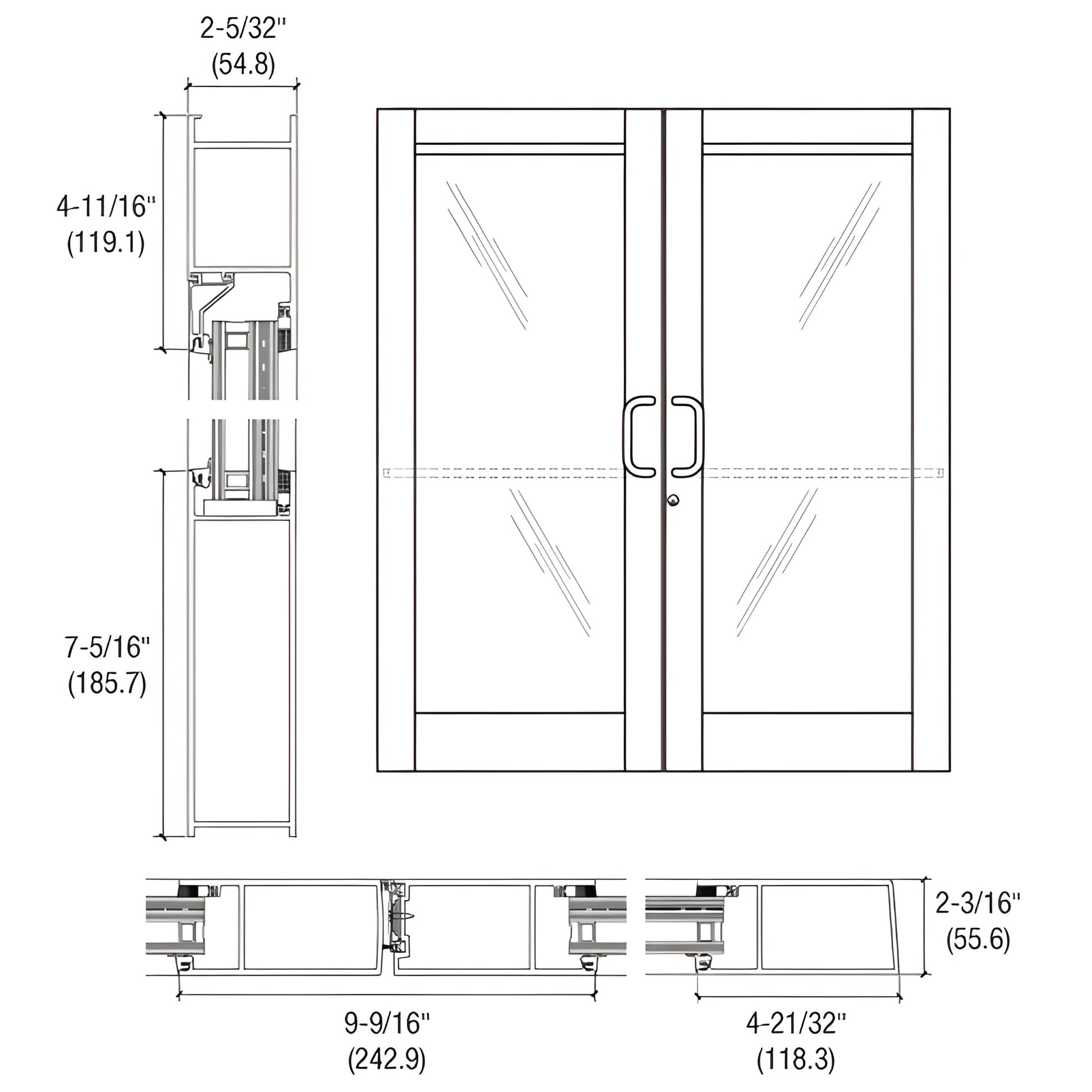 CRL Custom Blast Resistant Entrance Door (SKU: BZ62552) features 4-21/32" (118 mm) stiles, a 4-11/16" (119 mm) top rail, and a 7-5/16" (186 mm) bottom rail. Glass stops accept 1-5/16" (33 mm) insulating laminated glazing by others. Door is prepped for butt hinge hardware and CVR panic; custom fabrication options available for additional hardware such as pivots and commercial/architectural locking systems.